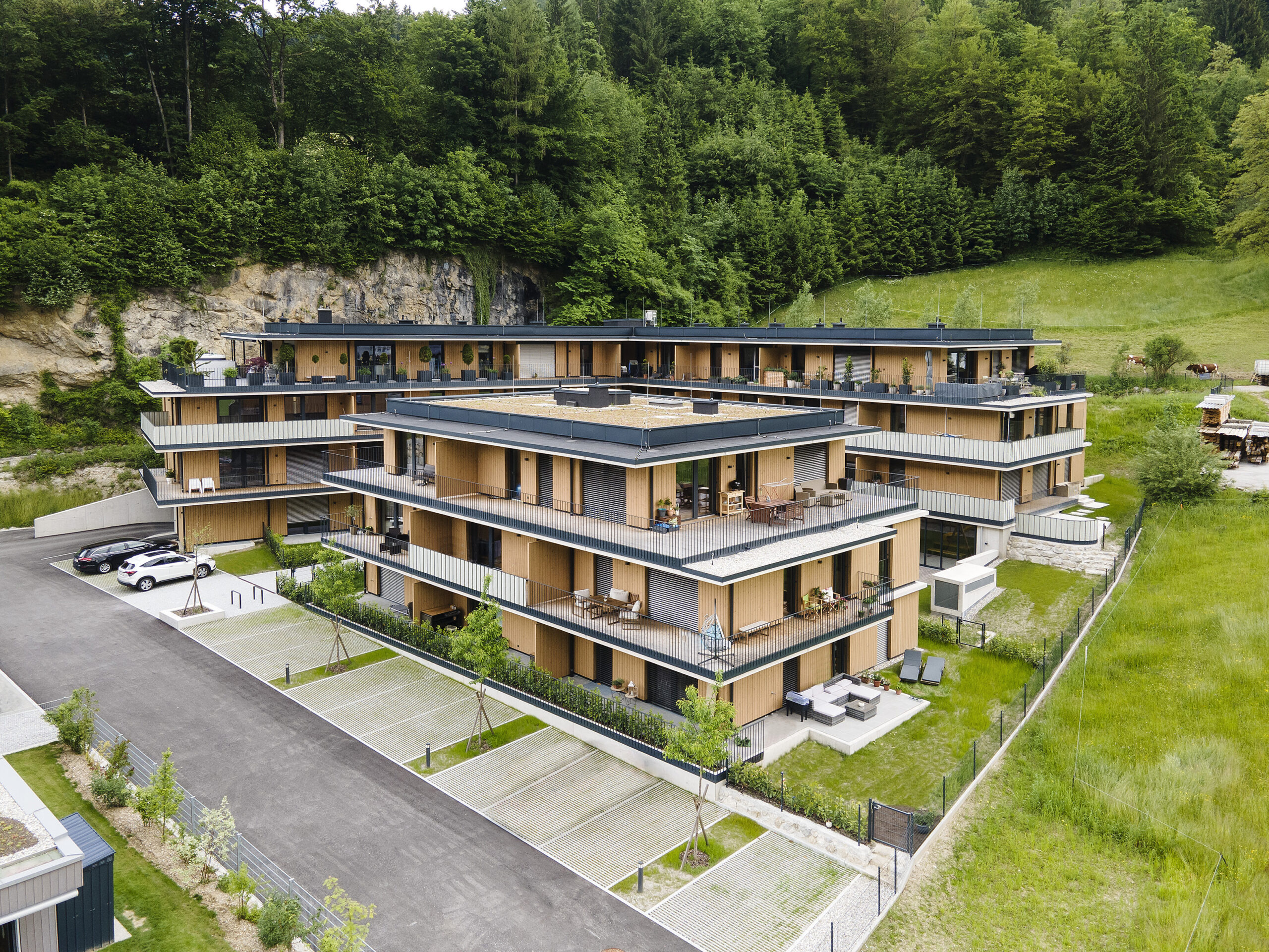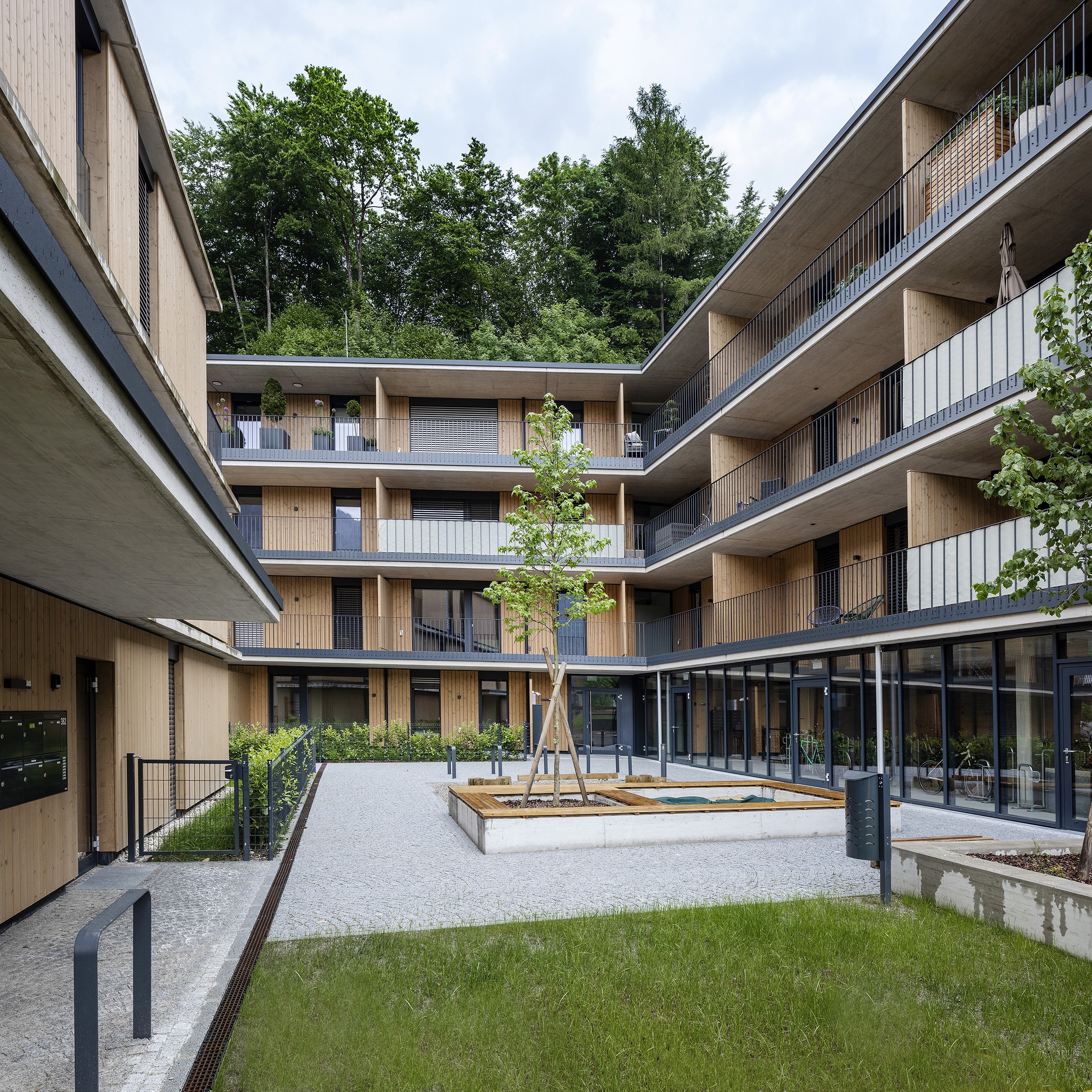 Vom Steinbruch über eine betriebliche Nutzung zur Wohnanlage, bestehend aus zwei Baukörpern, mit 29 Wohneinheiten – der Wandel eines speziellen Ortes in Scheffau am Tennengebirge. Haus 1 entwickelt sich aus der gegebenen Topographie als L-Baukörper und integriert die bestehende Stützmauer als Rückwand für den großzügigen Fahrradraum und den Gemeinschaftsraum mit Terrasse. Haus 2 schließt räumlich den Bauplatz nach Südwesten und lässt durch seine kleinere Proportion dennoch großzügige Sichtbeziehungen in die umgebende Berglandschaft zu. Zwischen den Baukörpern generiert sich ein kleiner Hof mit gemeinschaftlichen Einrichtungen mit hohen Aufenthaltsqualitäten für eine gute Nachbarschaft. Die bestehende Felswand, als einzigartige Kulisse, die an die frühere Nutzung des Ortes erinnert, wird beim Zugang zu den Wohnungen durch die großzügige Verglasung des Laubenganges in Szene gesetzt und erlebbar.